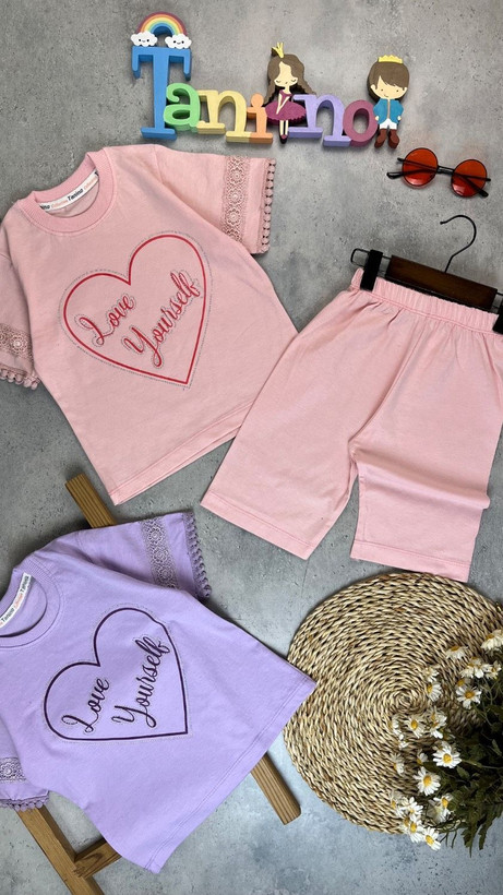 تیشرت شلوارک دخترانه پنبه سوپر،استین تور کاری شده